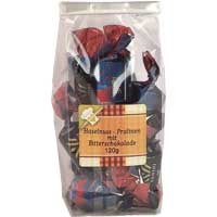 Pralinen aus Bitterschokolade mit Haselnussfüllung. Kann Spuren von MANDELN, CASHEWKERNEN und PISTAZIEN enthalten.